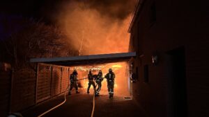 Am Neujahrsmorgen wurden die Feuerwehren Uplengen-West und Uplengen-Mitte zu einem Garagenbrand nach Kleinoldendorf alarmiert. Vor Ort stand eine Doppelgarage in Vollbrand, die unmittelbar an ein Wohnhaus angrenzte.